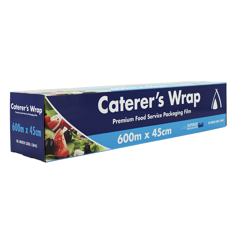 Caterer’s Wrap A perfect cling wrap solution for all foodservice wrapping applications. Easy to use slide cutter included with every roll. Features and Benefits A perfect cling wrap solution for all kitchen, food service and catering requirements. Longer stretch, excellent cling and optimum clarity. • Perfect for keeping food fresh • Longer stretch and excellent cling • Anti-Fog • Safety slide cutter • Suitable for all foodservice applications • Superior clarity when refrigerated